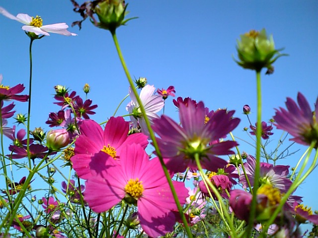 所々,茎が踏み倒されていても,それでも御天とさんに向かって咲き誇ろうとしているコスモスは,一つ一つ色合いも異なり我が我がと自己主張しているようでした.